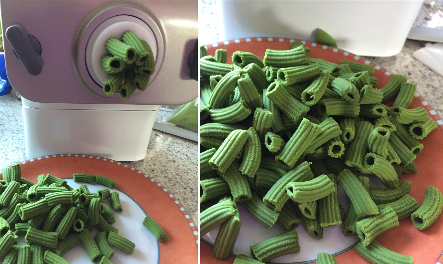 Seit einiger Zeit bin ich im Besitz eines Pastamakers von Philips, tja, was soll ich sagen, das Gerät ist einfach genial, man gibt Mehl bzw. Hartweizengrieß und Mehl und Wasser oben hinein, wählt das Programm und nach etwa 10 Minuten hat man die fertigen Rigatoni, die man nur noch kochen muss. Am besten schmecken uns die Nudeln mit original italienischem Hartweizengrieß (Semola die grano dura rimacinata ), dann haben sie eine tolle Farbe und einen guten Biss. Den Teig kann man noch mit Spinatpulver einfärben, wie ich es hier bei den Rigatoni gemacht habe.
