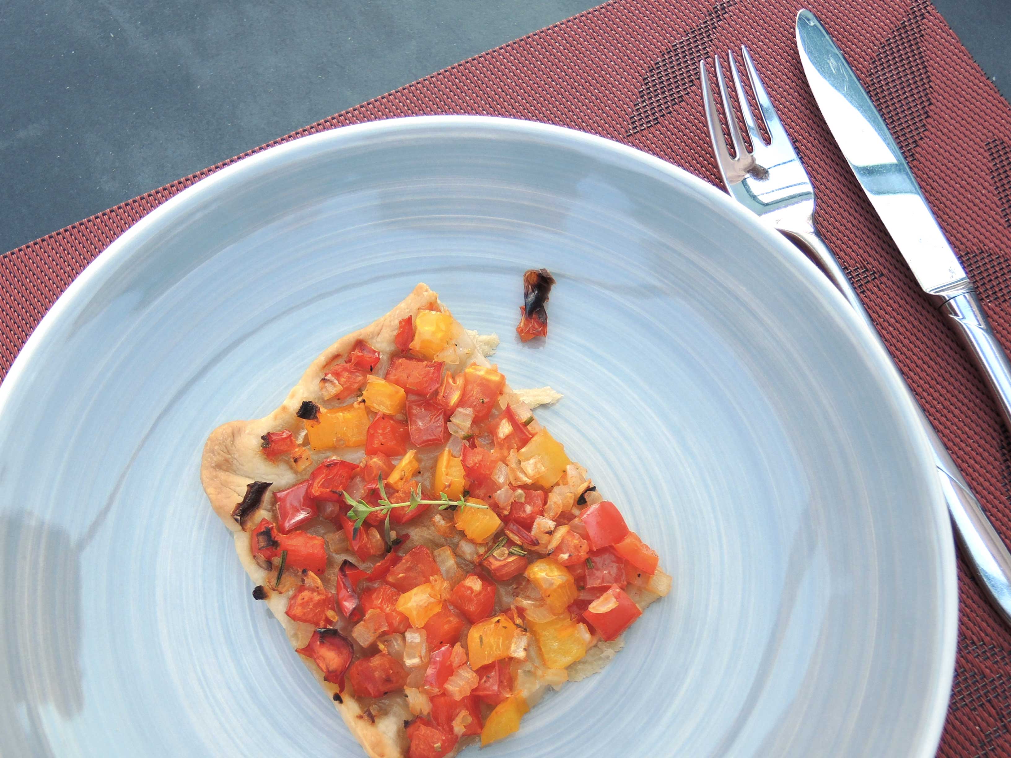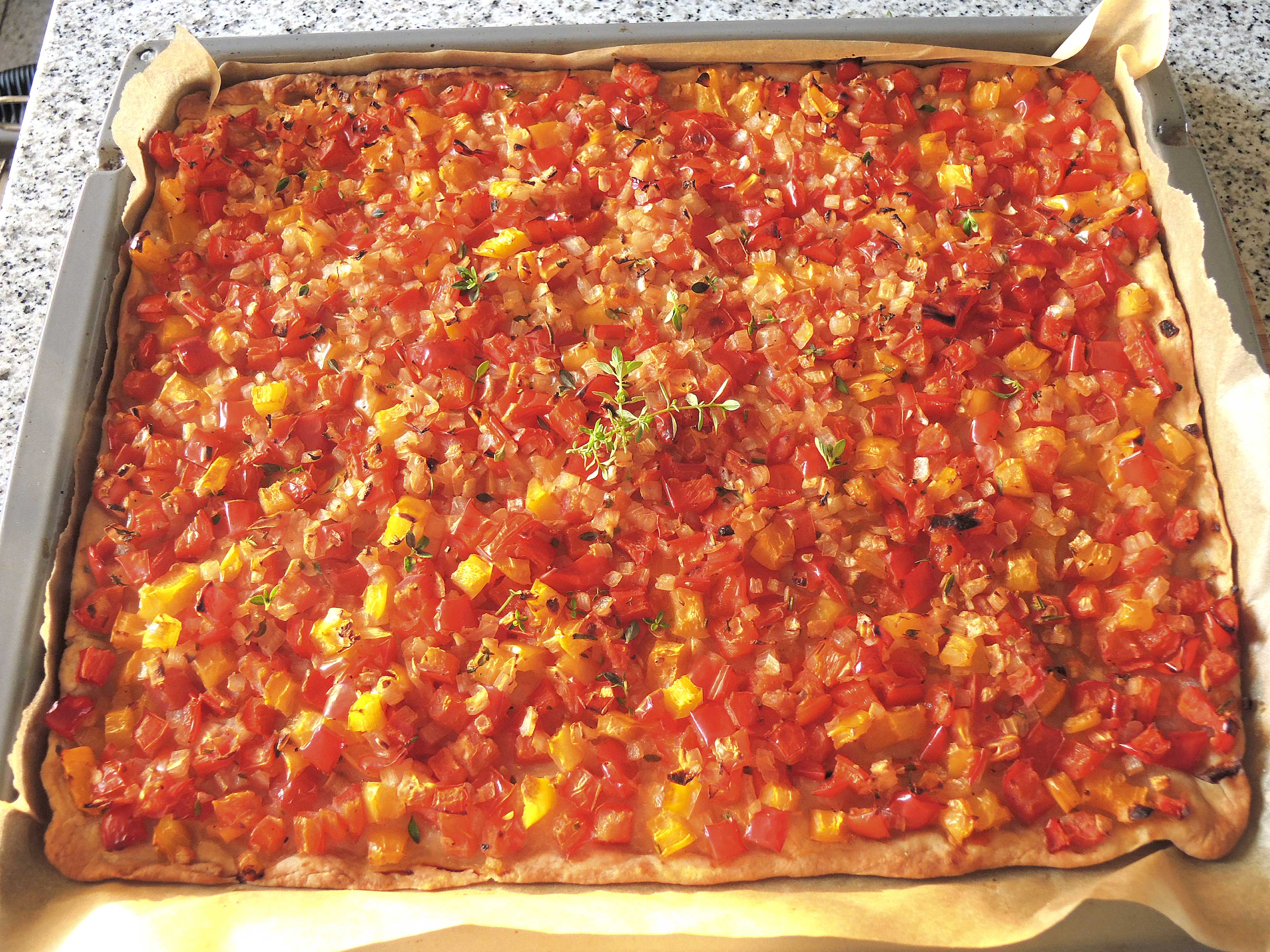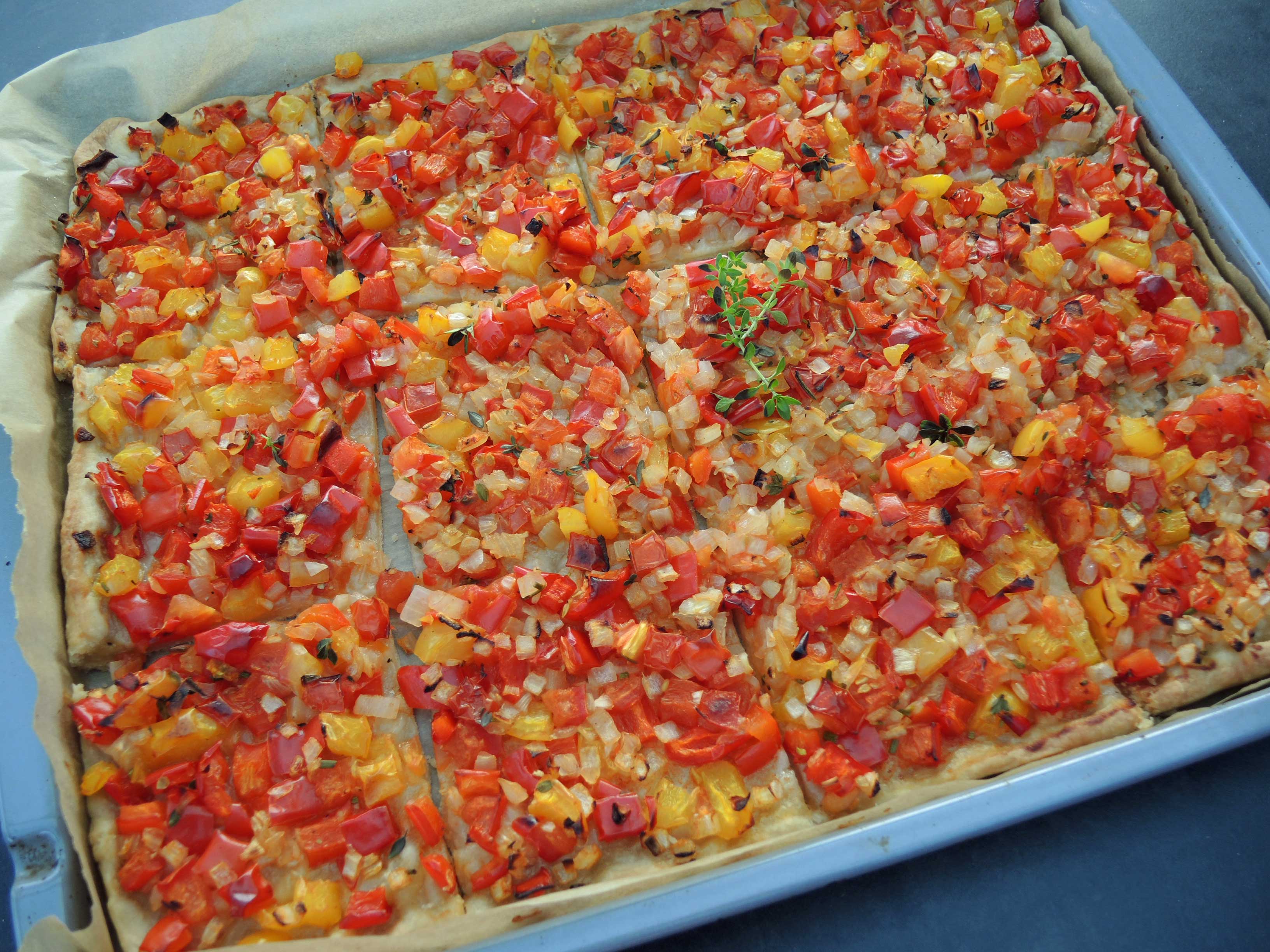 Vor ein paar Tagen wurde in der Fernsehsendung „Kaffee oder Tee“ das Rezept für einen spanischen Paprikakuchen gezeigt. Ich habe die Fernsehsendung nicht gesehen 😉 , aber meine Mutter hat mir so von diesem Rezept vorgeschwärmt, dass ich sofort nach dem Rezept gesucht habe und es ausprobiert habe. Minimal abgeändert, ich habe noch zusätzlich frische mediterrane Kräuter aus meinem Garten zugefügt und gelbe Paprika anstatt der grünen im Rezept verwendet. Herausgekommen ist ein sehr leckerer krosser Paprikakuchen, ein schönes Mittag- oder Abendessen an heißen Tagen, was ich bestimmt noch öfters backen werde. Und bei genauem Hinsehen ist der Paprikakuchen nicht nur vegetarisch, sondern auch noch vegan 🙂