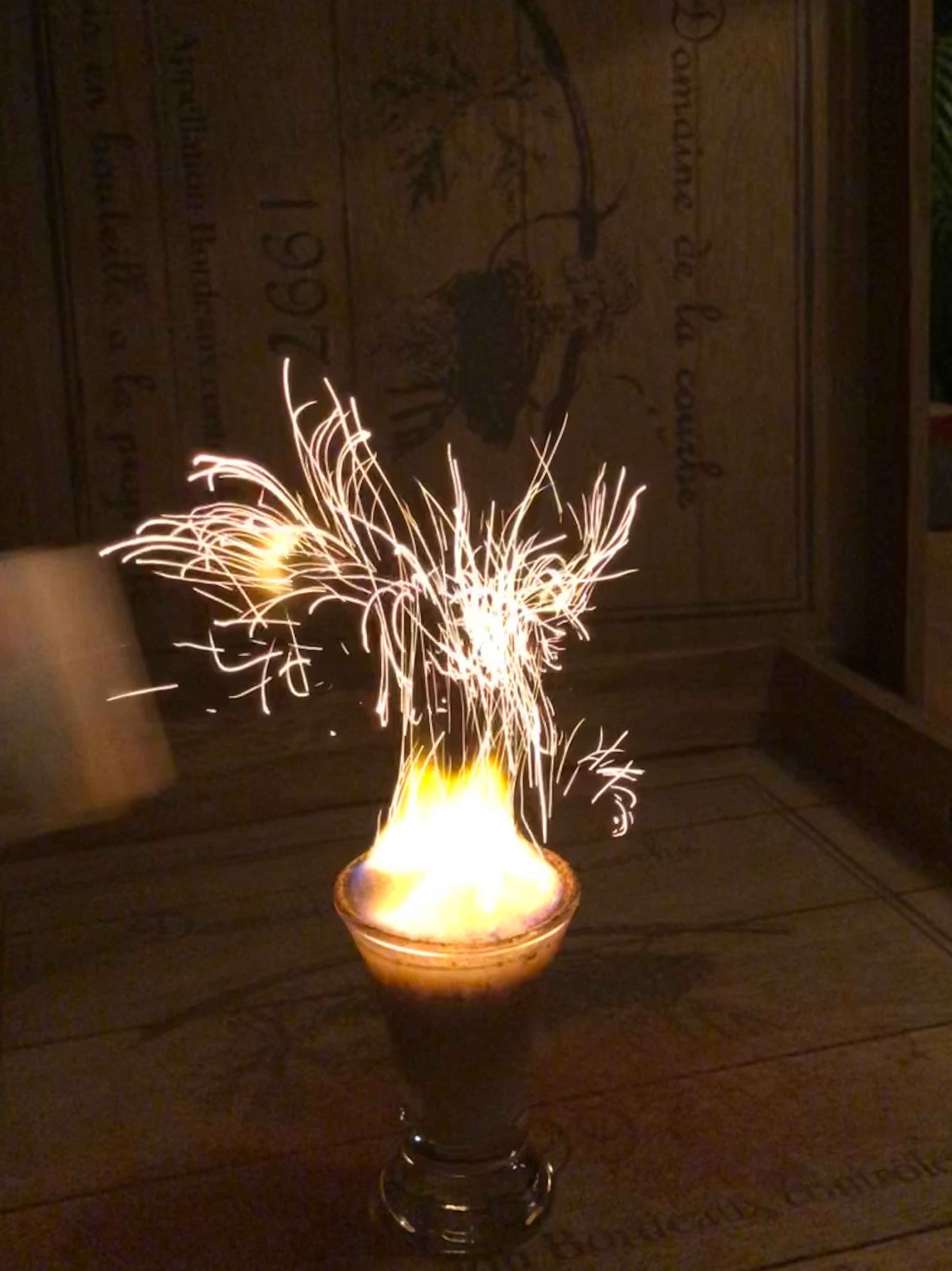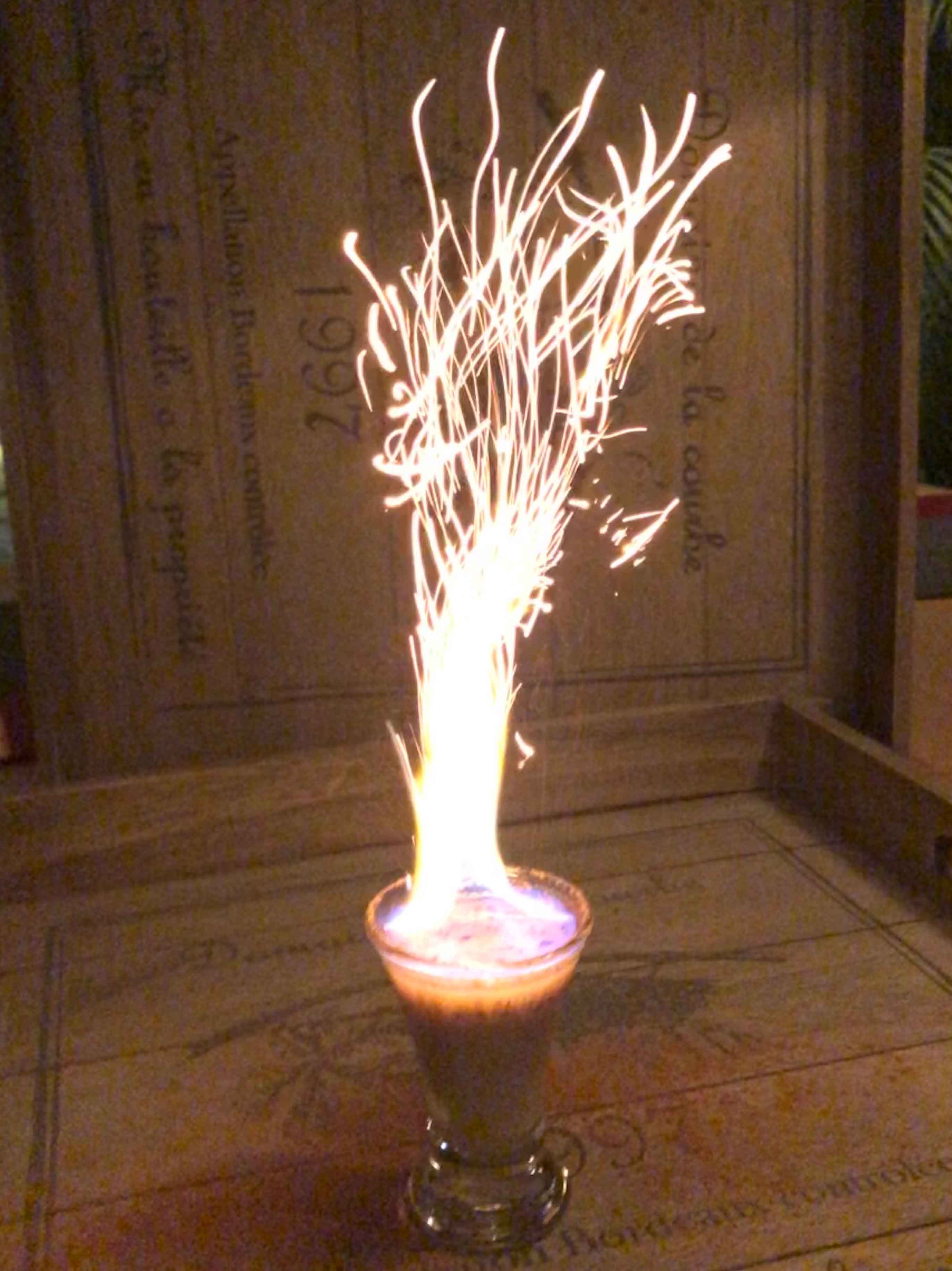 Im Original wird Baileys und Stroh Rum verwendet, den habe ich aber hier nirgends bekommen, so habe ich Pott Rum mit 54% verwendet, Hauptsache, es brennt!