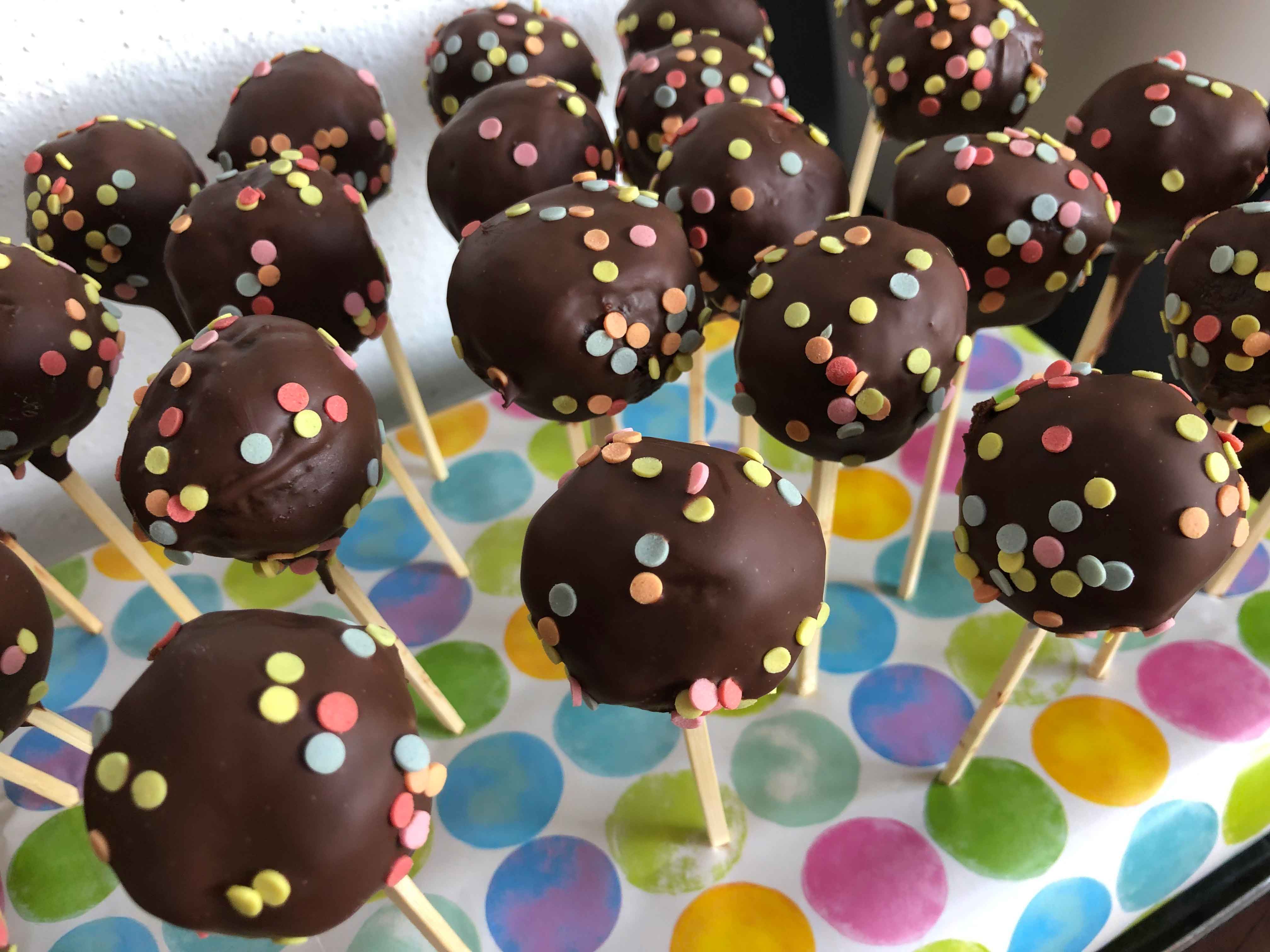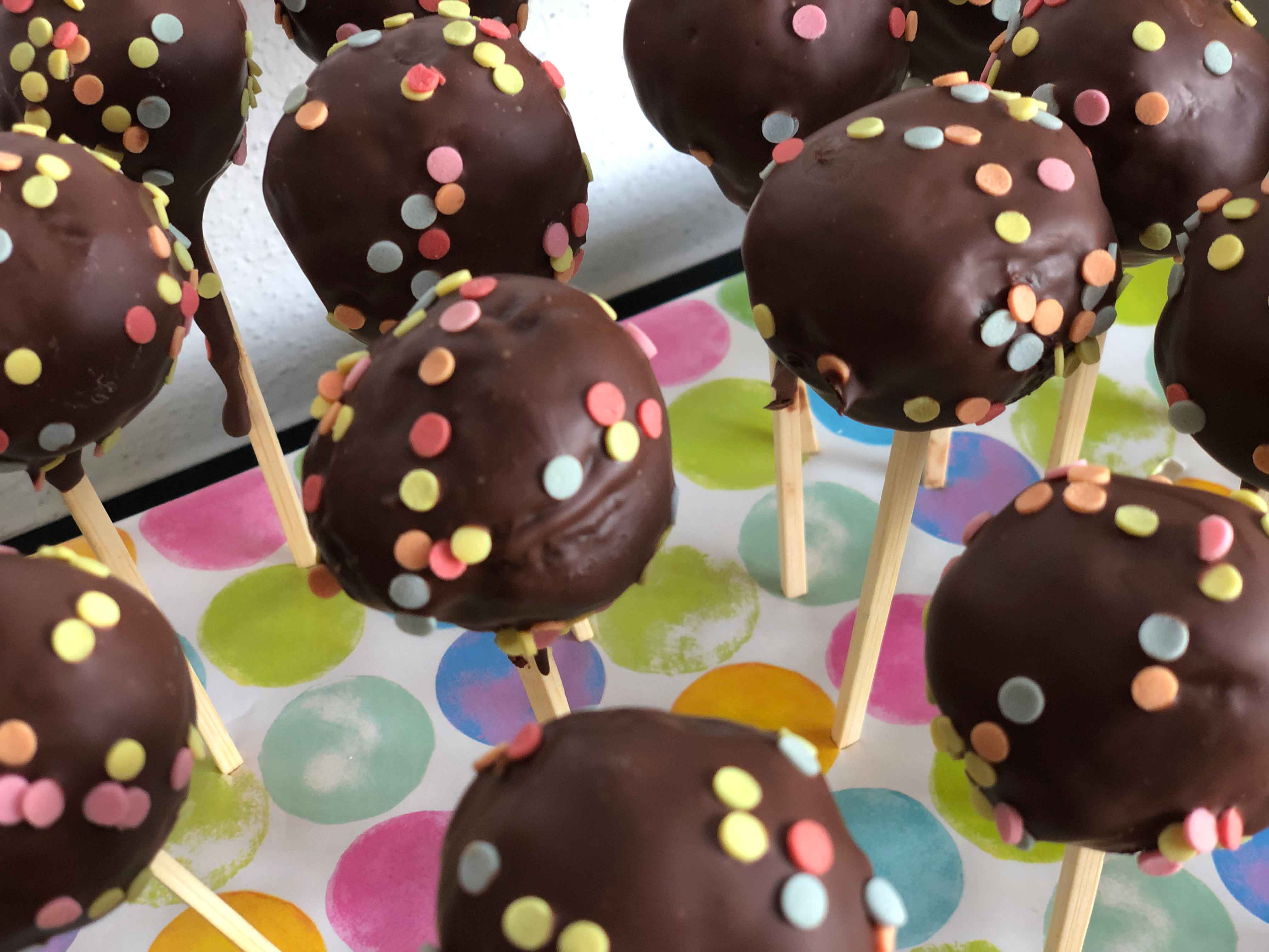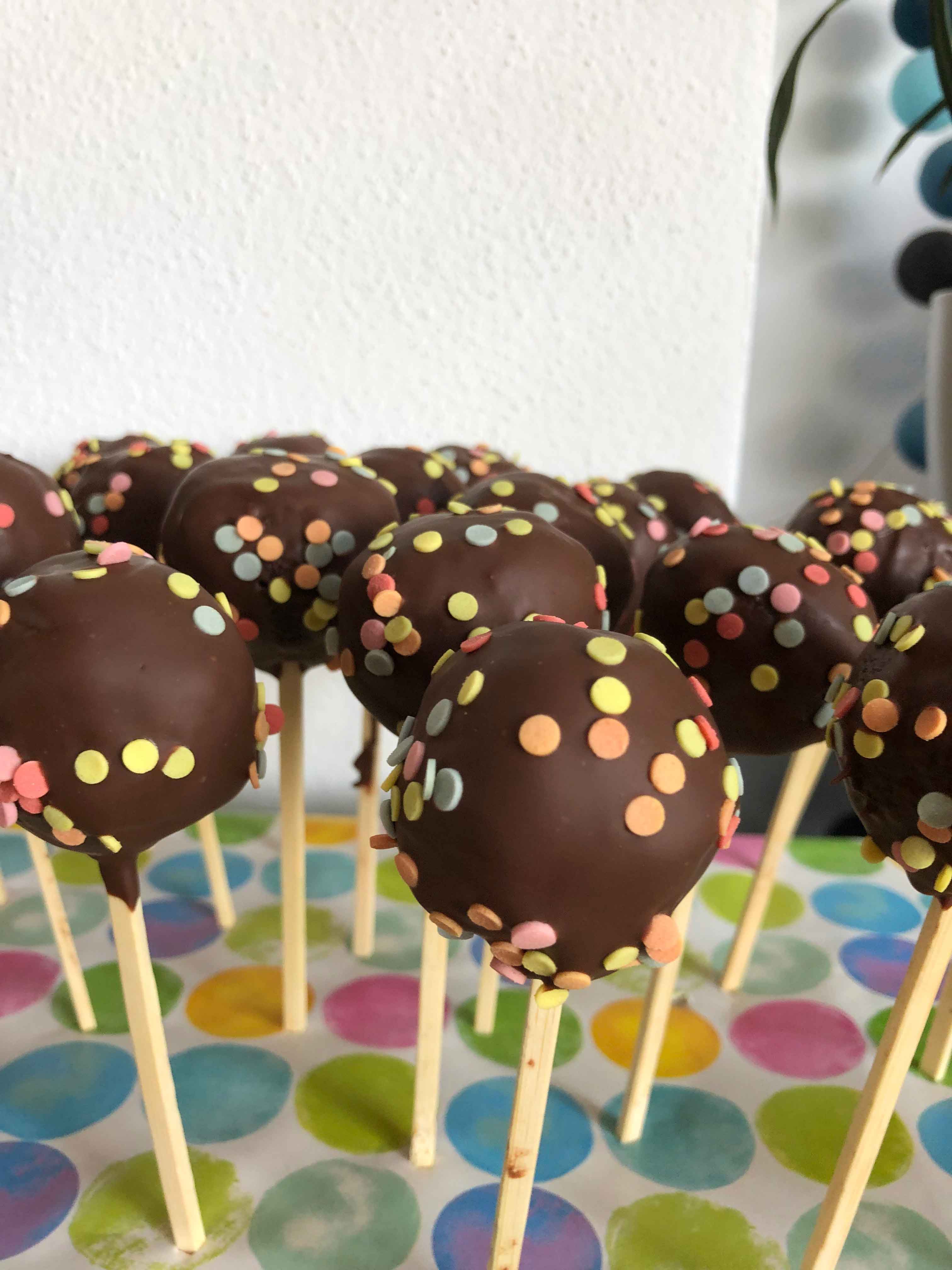 Eine passende Styroporplatte mit Geschenkpapier überziehen und die Cake Pops reinstecken. So lassen sie sich sehr gut transportieren und sind auch gleich servierbereit!