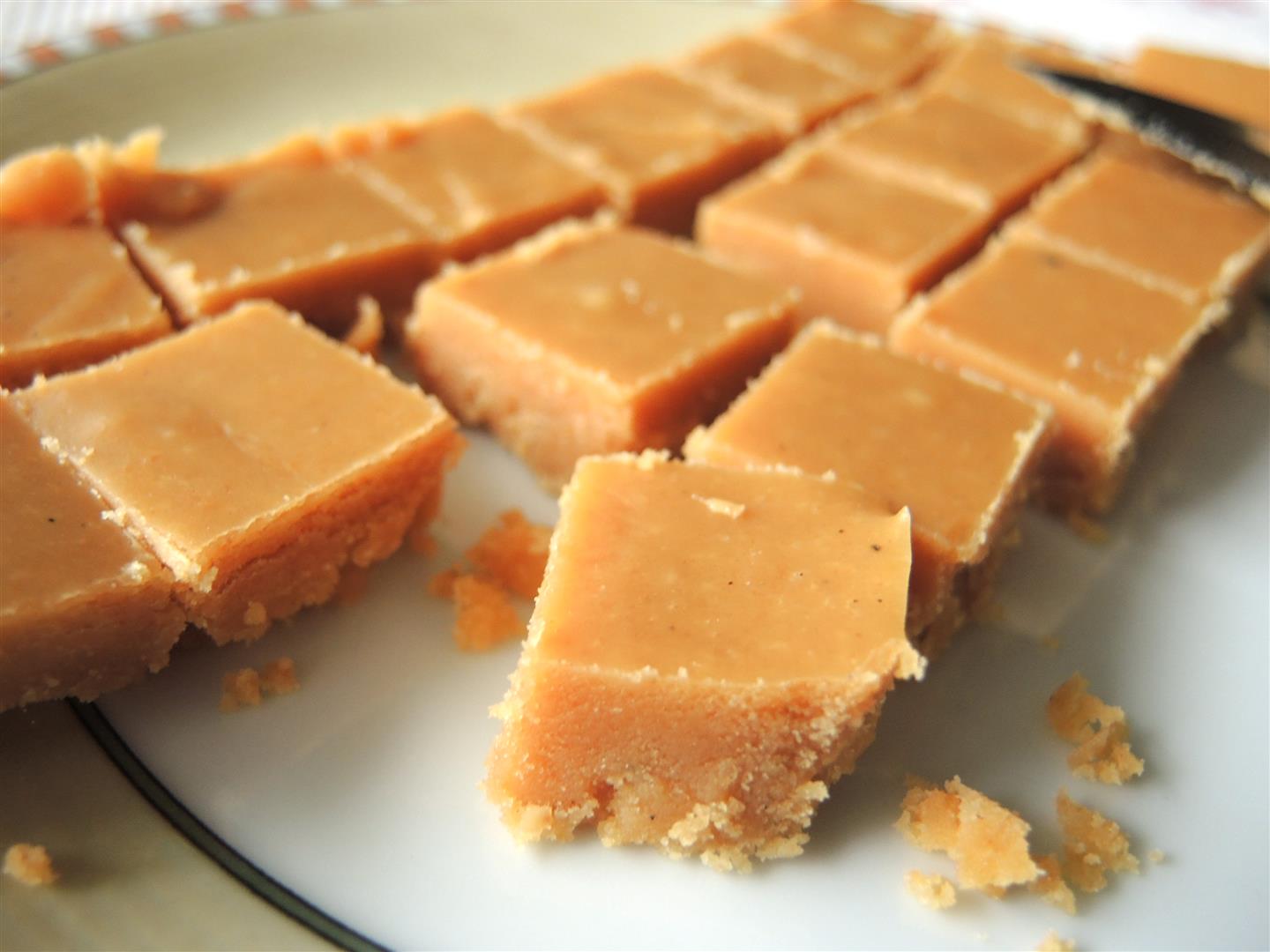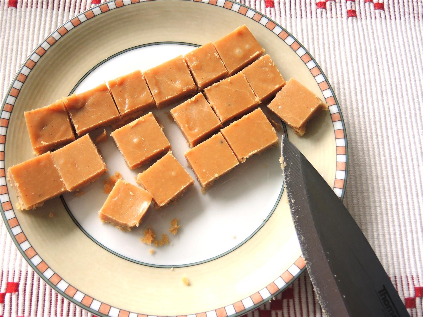 Das Karamell-Fudge kann man selber machen (hier ⇒ ein megaleckeres Rezept ) oder kaufen, notfalls durch weiche Karamellbonbons ersetzen.