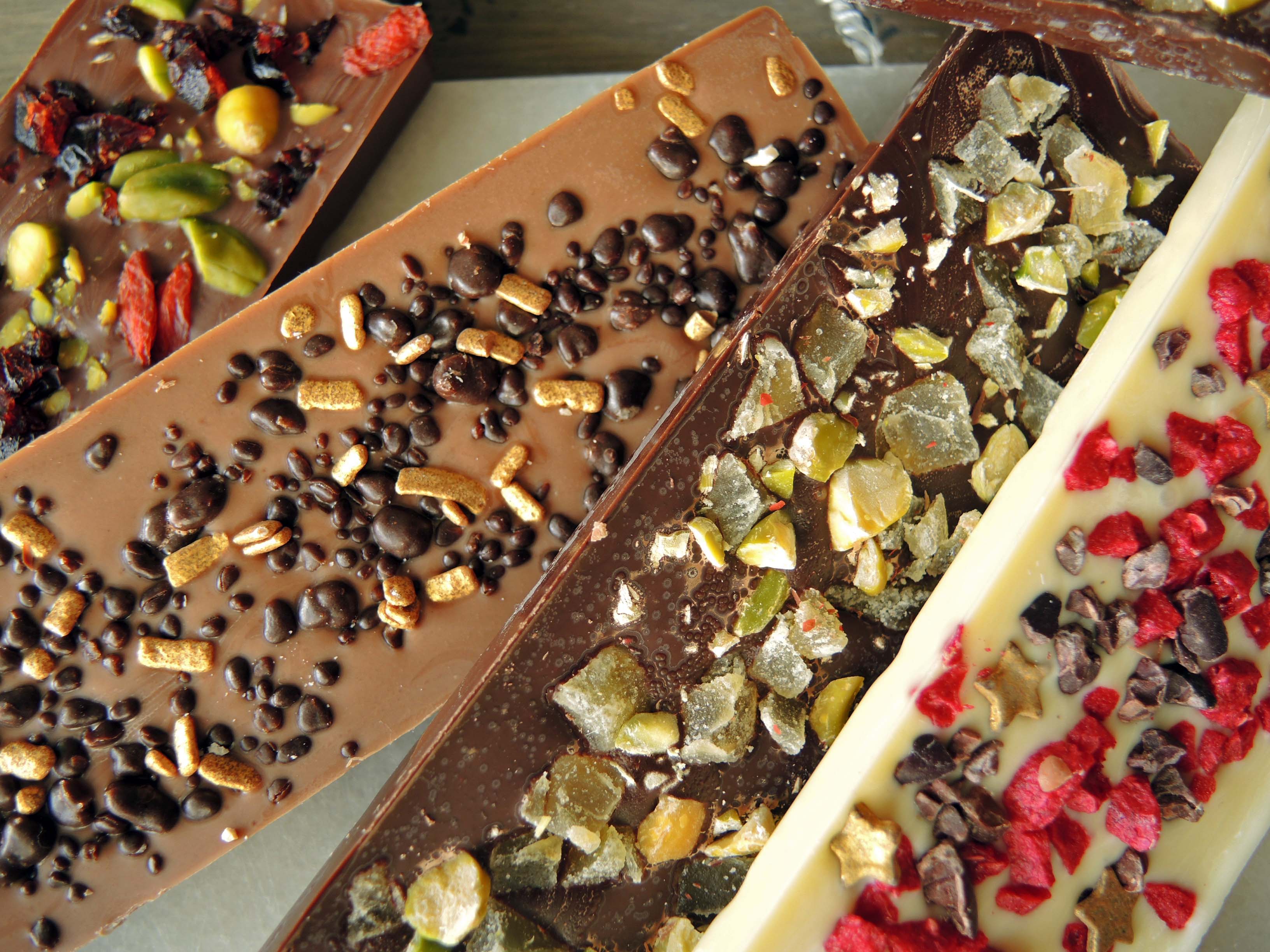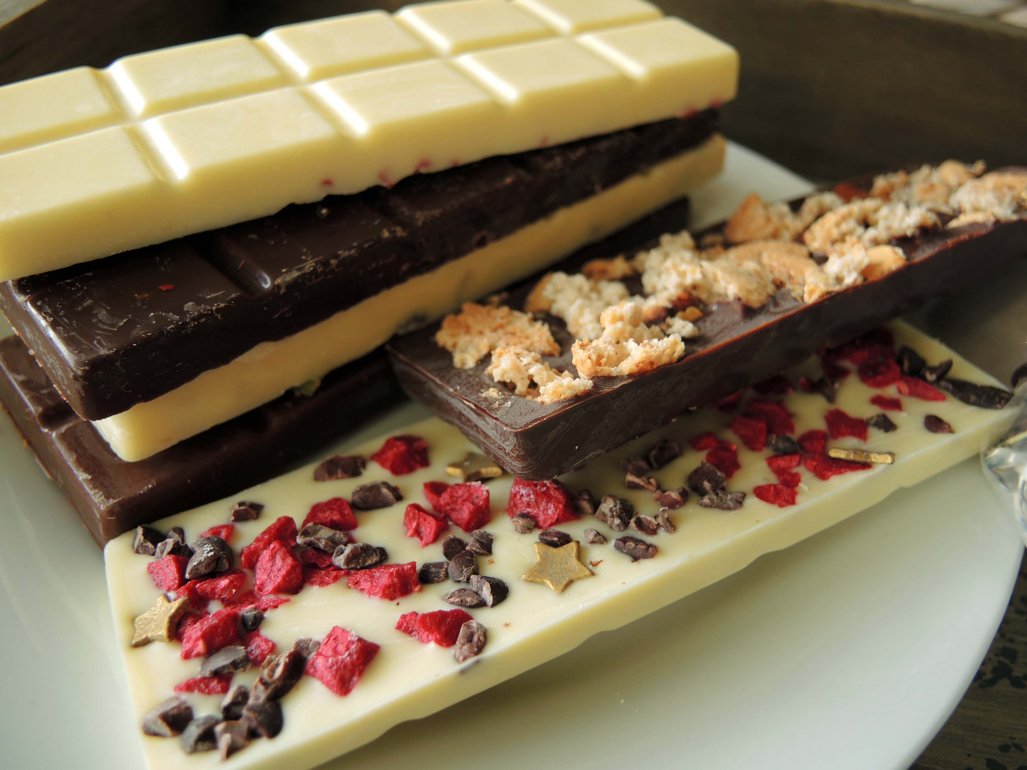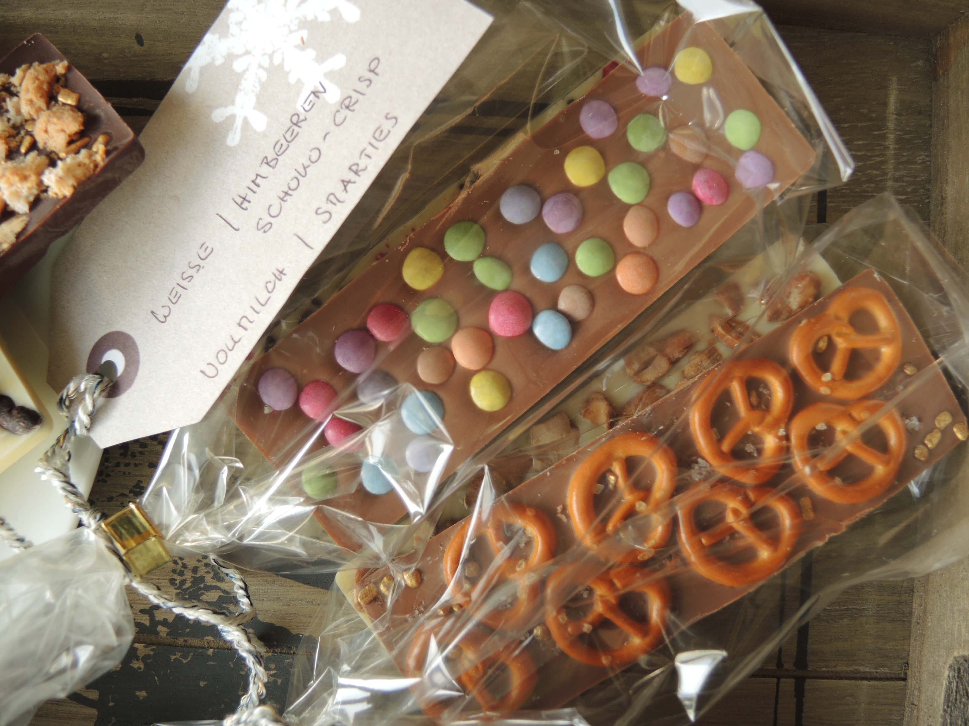 Kleine Schokoladentafeln verziert mit Nüssen, Trockenfrüchten, kandierten Früchten, Schokolinsen, Keksen usw., eurer Phantasie sind keine Grenzen gesetzt und die kleinen Tafeln sehen gut aus und eignen sich das ganze Jahr als Mitbringsel.