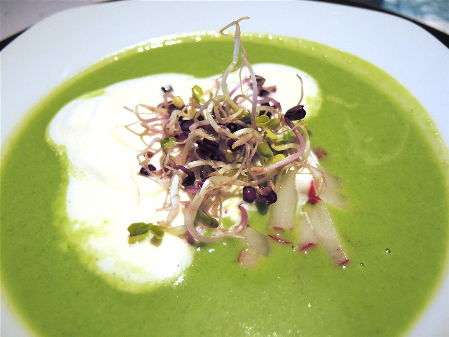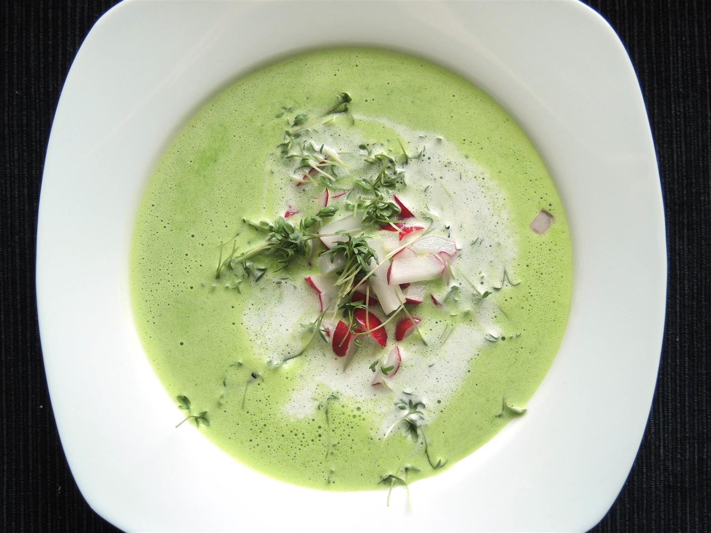 Grüne Radieschensuppe mit Wasabi-Sahne und Sprossen